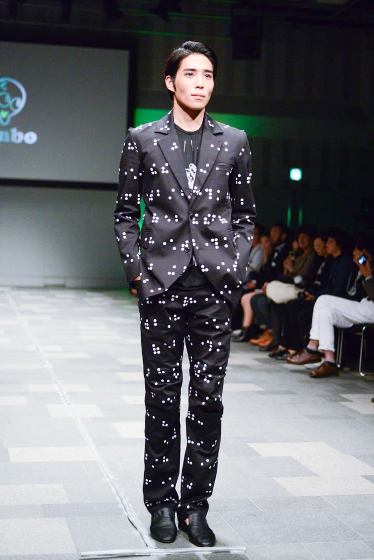 黒地に白く、「思いやり」「笑顔」「夢」を表す点字がプリントされたスーツ。これは立体的にプリントがされているので、指で触って読むことができます。