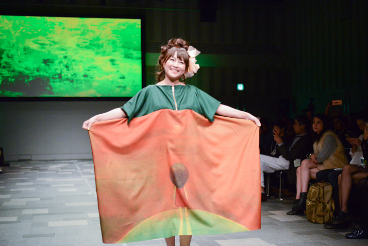 「兎追いしかの山 小鮒釣りしかの川 夢は今もめぐりて 忘れがたきふるさと」 スクリーンには、夕日を見上げる少女の後ろ姿。故郷を離れ療養所に入所した槙さんが、ファッションショーのなかで、生まれ育った故郷へと帰っていきます。