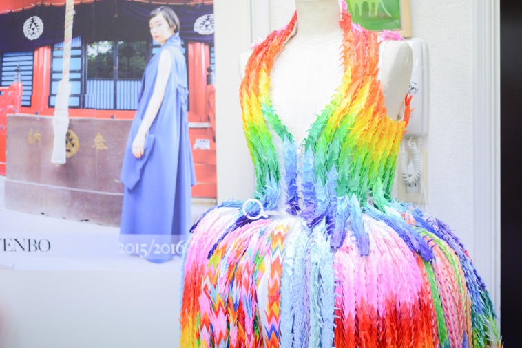 壁際に飾られているのは、折り鶴を使った大胆な発想のドレス。広島市から寄与された千羽鶴1万羽を使ったこのドレスは、戦争と平和をテーマにしたファッションショーで発表されました。