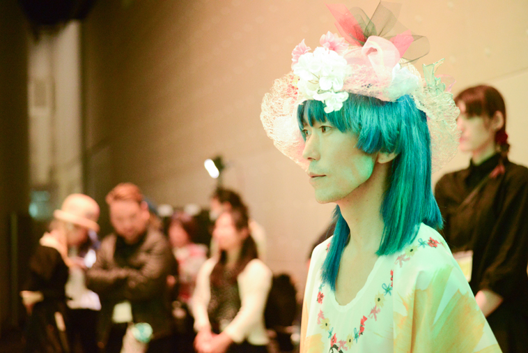 鶴田さんは、このショーのために集まった多くのメディアの取材を受けつつ、モデルたちの衣装やヘアメイクチェックにあたります。 ファッションショーの舞台裏と言うと、慌ただしいイメージがありますが、予想と打って変わって、控え室は和やかな雰囲気。