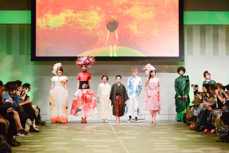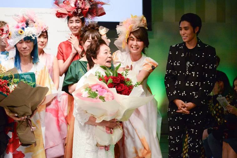 モデルたちがスクリーンの下に集い、「ふるさと」が穏やかに響く中、鶴田さんが、四季の花々が描かれた鮮やかなドレスと、花々が飾られた帽子で登場。大きな拍手の中、颯爽と歩き会場に向かって一礼をしたあと、両手で瞼の下を軽く抑え、槙さんの元へと向かい二人がハグをします。