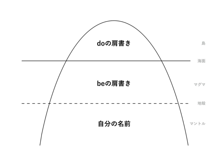 火山の図で表したもの。「do」の肩書きは海の外に出ている島、「beの肩書き」はその下にあるマグマなのだそう(提供写真)