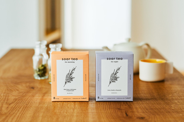 soarではウェブメディアで記事として回復の時間を届けるだけでなく、香りや味で優しく包まれる瞬間をお茶で届けるブレンドハーブティー「soar tea」を販売しています。